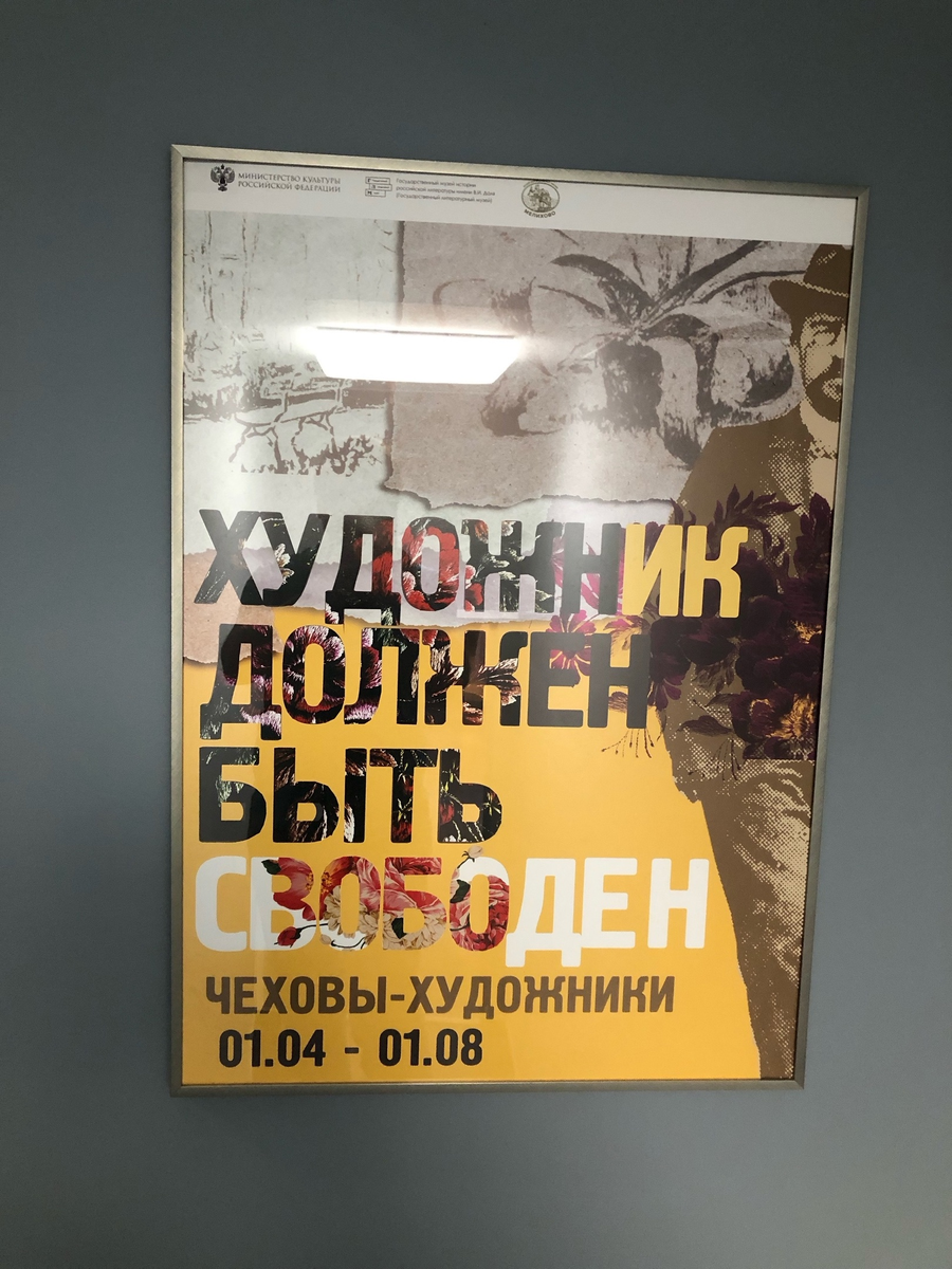 Начало тут, тут, тут и тут В доме-"комоде" проходят сменные выставки. В тот день, когда я там был, проходила выставка "Художник должен быть свободен". *** "...Среди разнообразных дарований, которыми обладали члены чеховской фамилии, на первое место должно быть поставлено художественное мастерство. Отпуская в 1875 году учиться в Московское училище живописи, ваяния и зодчества старшего брата А. П. Чехова — Николая, отец семейства Павел Егорович хорошо понимал, что такое художественное призвание, так как сам был не чужд ему. Художественный талант Чеховых — генетический. Мало кто знает, что предки А. П. Чехова по отцовской и материнской линии были иконописцами (выставку открывает икона кисти Василия Михайловича Чехова, двоюродного деда писателя, из собрания Музея-заповедника А. П. Чехова «Мелихово»). Потому неудивительно, что сестра Чехова Мария, братья — Николай и Михаил, сын и внук последнего — Сергей Михайлович и Сергей Сергеевич Чеховы стали признанными мастерами кисти и пера. Для Чехо