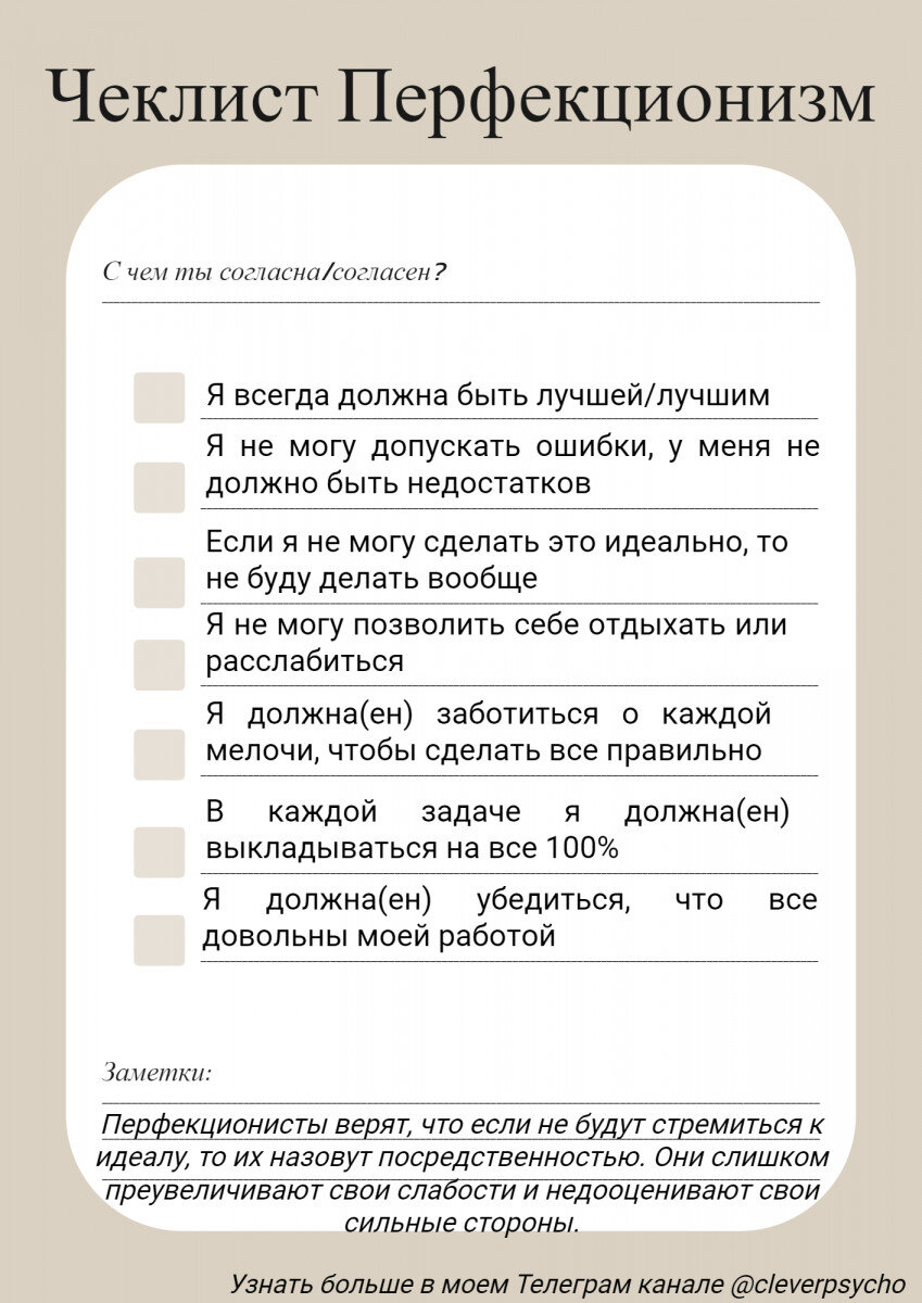 1. Я часто задерживаю выполнение задач из-за страха не справиться с ними на высоком уровне? 2. Я часто переживаю из-за мелких ошибок и недочетов, которые другие люди не замечают? 3. Я часто критикую себя за то, что не достигаю своих высоких стандартов и ожиданий? Чем больше "да", тем вероятнее наличие у вас перфекционизма. Вы все знаете, что это такое - стремление делать все идеально, быть лучшей и тд.