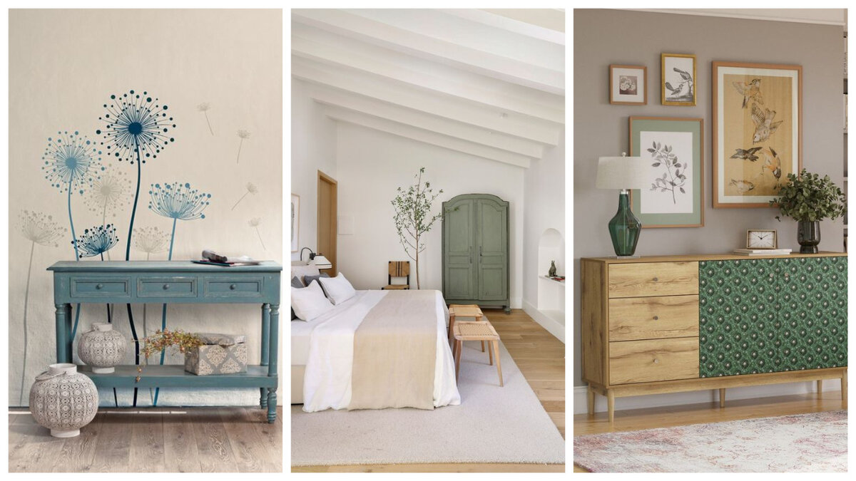 Создать стильный и гармоничный интерьер – задача непростая. Но совершенно особенное эстетическое удовольствие я получаю, когда разглядываю фотографии вот таких интерьеров! Про себя я называю их «одно целое»: каждая деталь играет роль в общем хоре и в результате получается нечто невероятно гармоничное, словно вся комната – это живописная картина, а не просто сборище подходящих друг к другу предметов. Сегодня попробую понять, как добиться такого эффекта. В первом примере это ощущение достигается за счет текстур и цвета. Дверь и тумба одинаково «состарены», а оттенок рисунка на стене поддерживает их цвет. Элементы декора согласуются с оттенком пола! Вот это пиршество для глаз! На втором фото играет роль общая согласованность природных цветов и материалов. Единственный цветной акцент комнаты – шкаф – поддерживается деревцем. На третьем фото тоже играет значимую роль сочетание текстур пола, тумбочки, рамочек для картин и даже фона одной из них! В декоре тумбы и лампе используются близкие