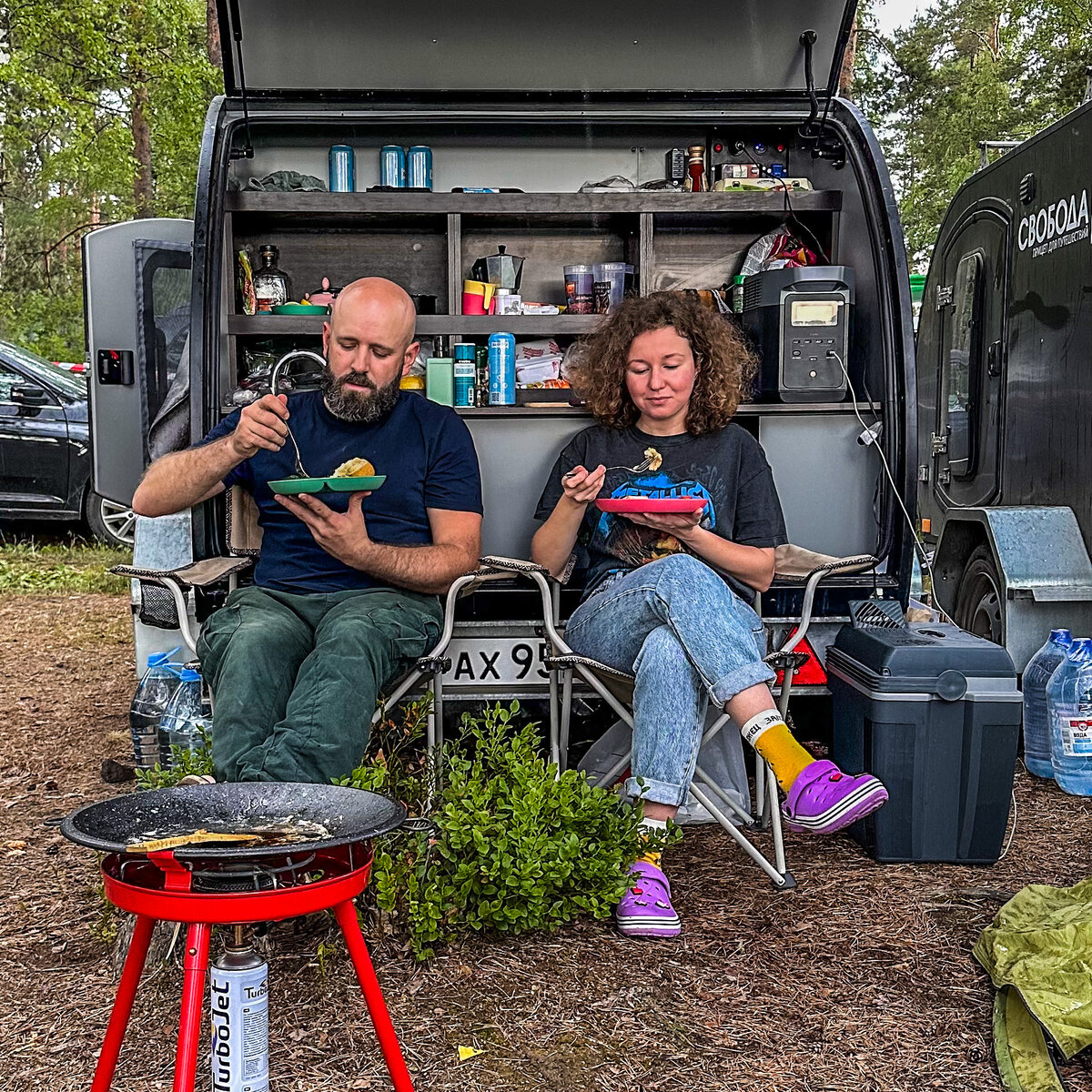 В статье вы узнаете: Прицеп-капля «Свобода» Мы давно хотели прокатиться с «каплей» и рассказать вам, каково это после автодома со всеми удобствами. С заводом «Свобода» в Петербурге мы знакомы уже как год, поэтому и взяли эту марку на пробу. В движении прицеп показал себя отлично. 100 км/час мы ехали по шоссе спокойно и без напряга для машины. У нас VW Golf 5 на ручке, чуть больше 100 л.с. Расход подрос незначительно. По лесной дороге проехали довольно сложные участки, которые вряд ли стали бы штурмовать на нашем ретро-автодоме. Да просто жалко его испытывать... Комплектация «капли» нам досталась скромная. На борту был электропакет с солнечной панелью, небольшим аккумулятором, бак с запасом воды и мойка с краном. Внутри "Свободы": матрас, полки для вещей, розетки, освещение, вентиляция. Перед выездом пришлось купить переносной биотуалет и палатку для него. Без этого в путешествии никак. Комфорт Опыт для нас интересный, несмотря на то, что мы заведомо знали, что снижаем привычный уровень