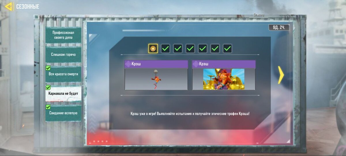 16 июня 2023 в Call of Duty: Mobile стало доступным для выполнения четвертое сезонное задание «Карнавала не будет» главными наградами которого являются: эпический амулет – «Крэш» и эпическая визитка «Крэш». Задание посвящено коллаборации Call of Duty: Mobile с Крэшем Бандикутом. Выполнение этого задания строится, прежде всего на игре в различных боях в королевской битве, а также сетевой игры. Задания очень простые, выполняются в королевской битве каждый этап за одну игру, однако есть этапы, где нам придется играть в сетевые игры. Я прохожу все эти задания параллельно и в рейтинговых сетевых играх, и в королевской битве. 1 этап заключается в следующем: необходимо приземлиться в области с лучшими трофеями в боях в королевской битве. Данные области на карте королевской битвы отмечены оранжевым цветом при вылете, ищем самую ближайшую и прыгаем в нее. Так нужно сделать 2 раза. Награды 1 этапа: Кредиты внутриигровой валюты х200 и очки опыта боевого пропуска х1000. 2 этап заключается в следую