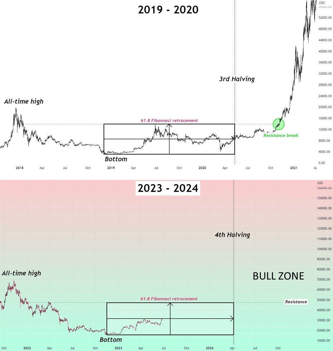 🔺Согласно метрикам, BTC в точности повторяет движение 2019-2020 годов: совпадают все локальные заномерности. А это значит, наивысший пик актива придется на зиму-весну 2025 года👇