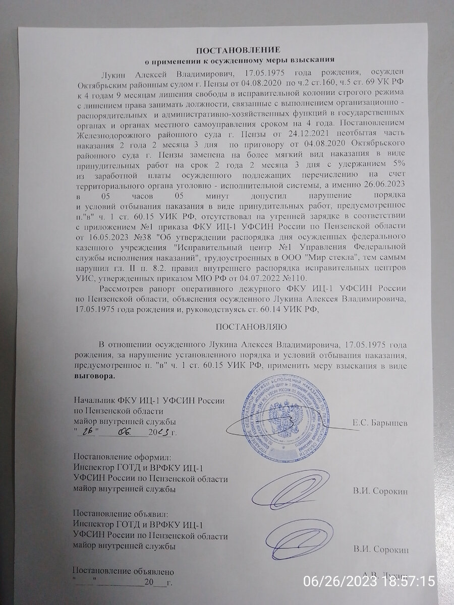 Серия рассказов "Знакомьтесь Эталон борьбы с преступностью. Часть раз.. Нету сил молчать... Ибо об этом событии должны знать Все!!! Ибо это просто образец, я бы даже сказал ЭТАЛОН БОРЬБЫ С ПРЕСТУПНОСТЬЮ!!! Речь пойдет об майоре внутренней службы, ФСИН сотруднике; "Господине Барышеве Е.С." И как, он до сих пор майор, предлогаю сразу после ознакомления с данной статьей дать ему ну минимум Полковника! И орден и медаль... Но давайте в суть так сказать... Не далее чем 26.06.2023 в ИЦ -1 г. Пензы, где господин Барышев исполняет так сказать, случилось следующее, трое осуждённых, включая меня опоздали на утреннюю зарядку... Вы только вдумайтесь, суть нарушения!!!ОПОЗДАЛИ НА УТРЕННЮЮ ЗАРЯДКУ, на целых пять минут.. Уточнение Исправительный центр это не тюрьма, это якобы то место, где осужденные должны одаптироваться к жизни на свободе, после тюрьмы, после режима!!! А цель руководство сотрудников ИЦ, по мере возможности помогать в этом осужденным. Но у майора Барышева Е.С. видимо другая цель,