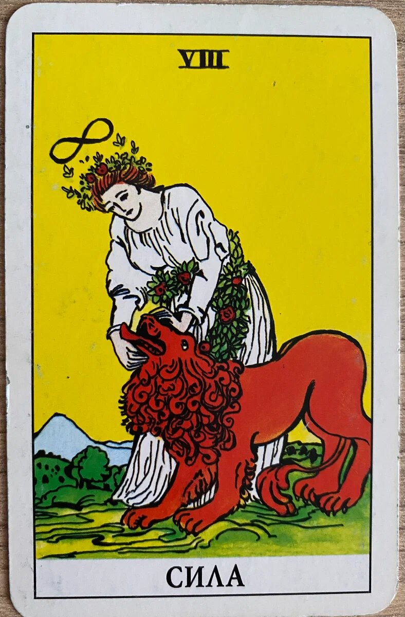 По СИЛЕ происходит ласковое, любовное и в то же время твердое укрощение страхов, агрессии, влечения, как бы без видимых усилий, только внутренней силой духа. Карта по сути описывает сам механизм самоконтроля, управления собой, своими сильными и безрассудными желаниями. Мудрость СИЛЫ - действовать только твердостью духа, добротой и верой, а не убить, а подчинить.
