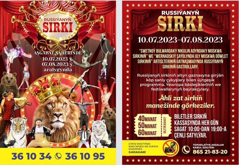 В Туркменистане начинаются гастроли Большого Московского Государственного цирка на проспекте Вернадского и Московского цирка Никулина на Цветном бульваре. Российские артисты выступят не только в Ашхабаде, но и в велаятах страны. С 10 июля по 7 августа в Государственном цирке Туркменистана; С 9 по 18 августа в здании «Türkmeniň ak öýi» Дашогузского велаята; С 22 по 31 августа в здании «Türkmeniň ak öýi» Лебапского велаята; С 3 по 12 сентября в здании «Türkmeniň ak öýi» Марыйского велаята; С 15 по 24 сентября в здании «Türkmeniň ak öýi» Балканского велаята. Мастера российского цирка — победители многих престижных международных конкурсов и фестивалей, представят в Туркменистане уникальную программу с множеством номеров, вошедших в золотой фонд российского цирка. Билеты можно приобрести ежедневно с 10:00 до 19:00 в кассах Государственного цирка.