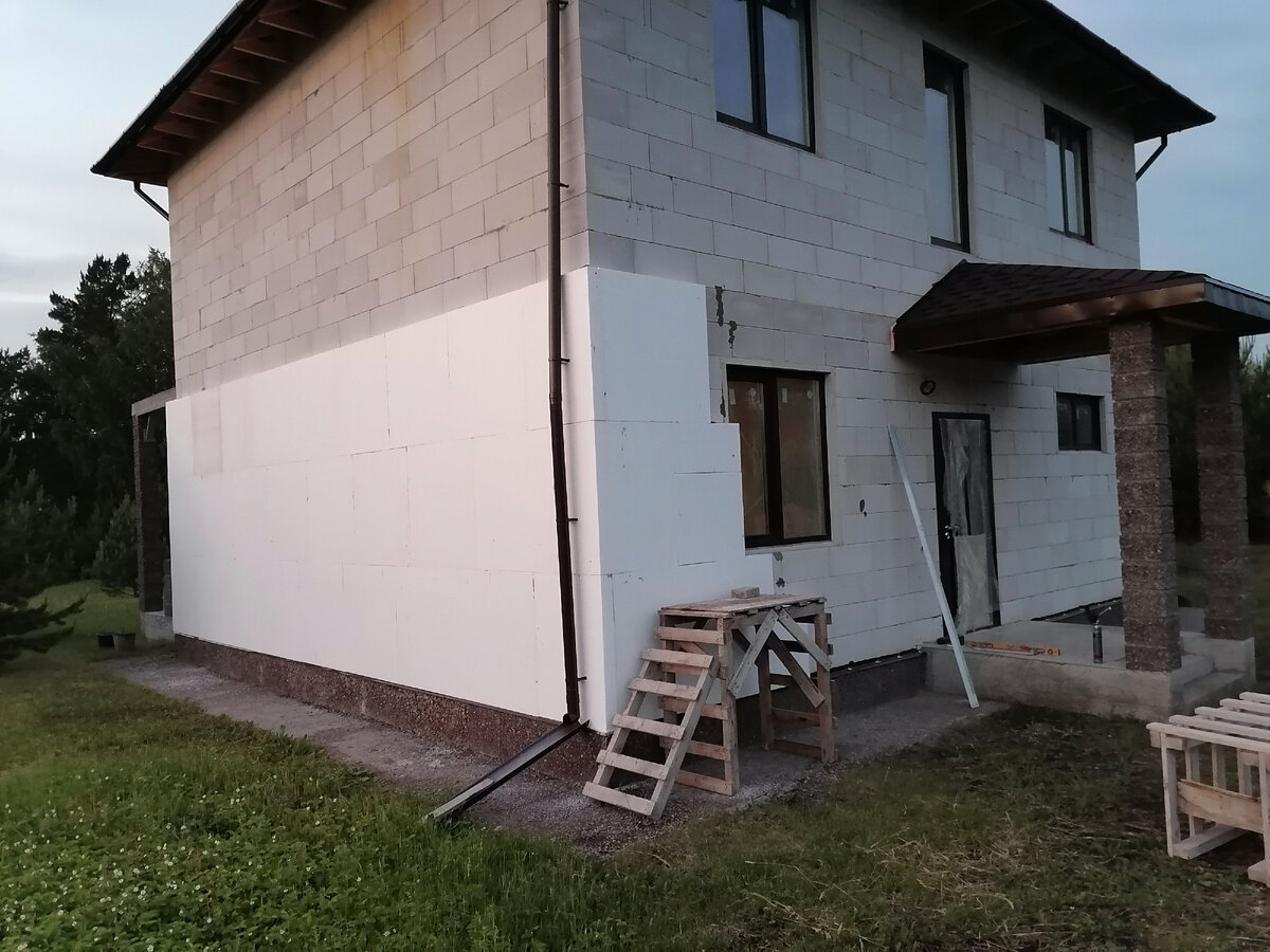 Утепление дома решил сделать сам. Утепление пенополистиролом ППС 16Ф и фасад из АМК. Почему сам? То, что я умею (или могу) и то, что мне нравится делать – делаю сам. Не только ради экономии, но и для качества. Некоторые мастера и специалисты, которых привлекал, не все сделали как себе. Доволен остался работой только по обвязке котельной и по электрике.