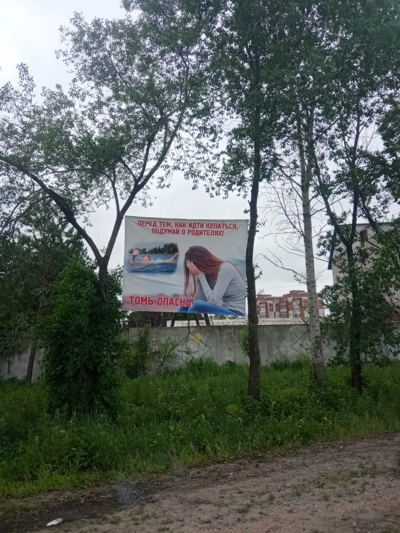 По поручению главы города Станислава Мелюкова, сотрудники Управления по делам ГО и ЧС вновь растянули баннер на береговой линии Томи вблизи переулка Звездный. На баннере изображена плачущая женщина и надпись: «Перед тем как идти купаться, подумай о родителях. Томь опасна».