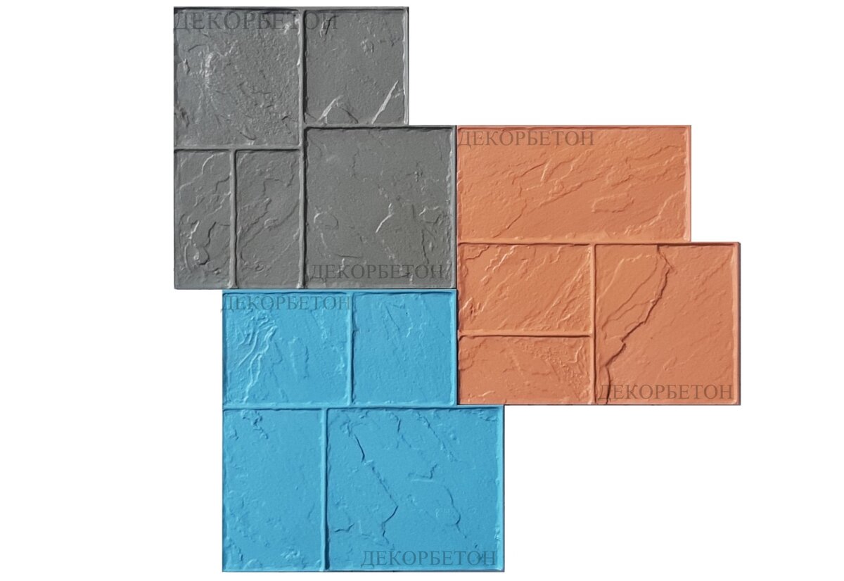 Форма для Печатного бетона имитирует поверхность из камней правильной формы напиленных разными размерами. Каждая форма для удобства работы сзади оснащена закладными ручками (кроме мягкой). Три формы с различной текстурой камней (красный, синий, серый).