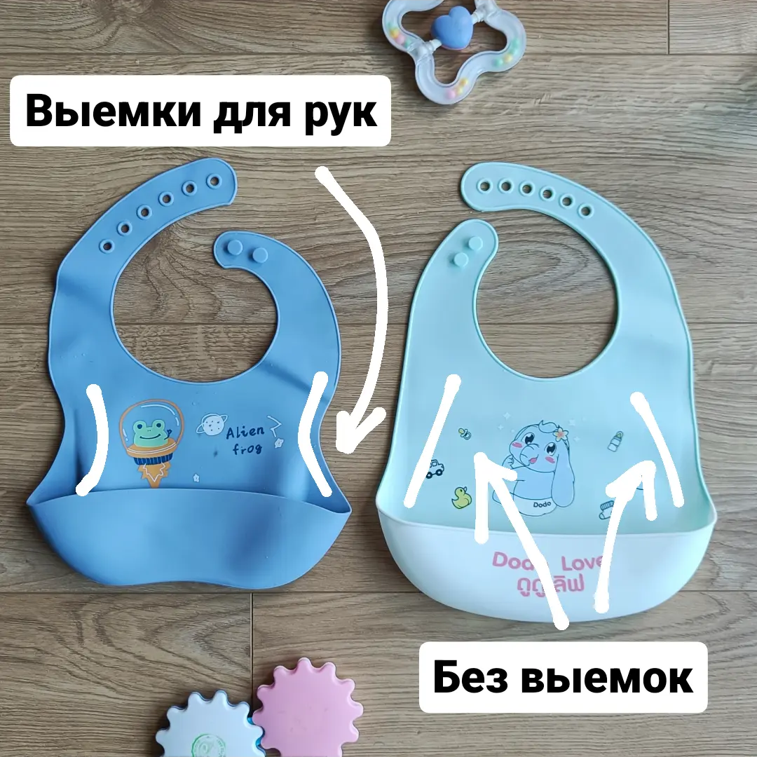 У нас оказалось два силиконовых слюнявчика. Они почти одинаковые, но я нашла ощутимую разницу и теперь у меня есть фаворит 👍 При самоприкорме сын активно работает руками. Они у него летают по всюду) не только в тарелке и во рту 😅 Я заметила, что слюнявчик без выемок для рук иногда мешает движениям. Он часто сминает его, когда тянется за едой в тарелку. Из-за этого еда не всегда ловится слюнявчиком. Больше еды разбрасывается по всюду. Такой истории со слюнявчиком с выемками нет. По моим наблюдениям, он оказался более удобен. В любом случае, это наш опыт использования 😉