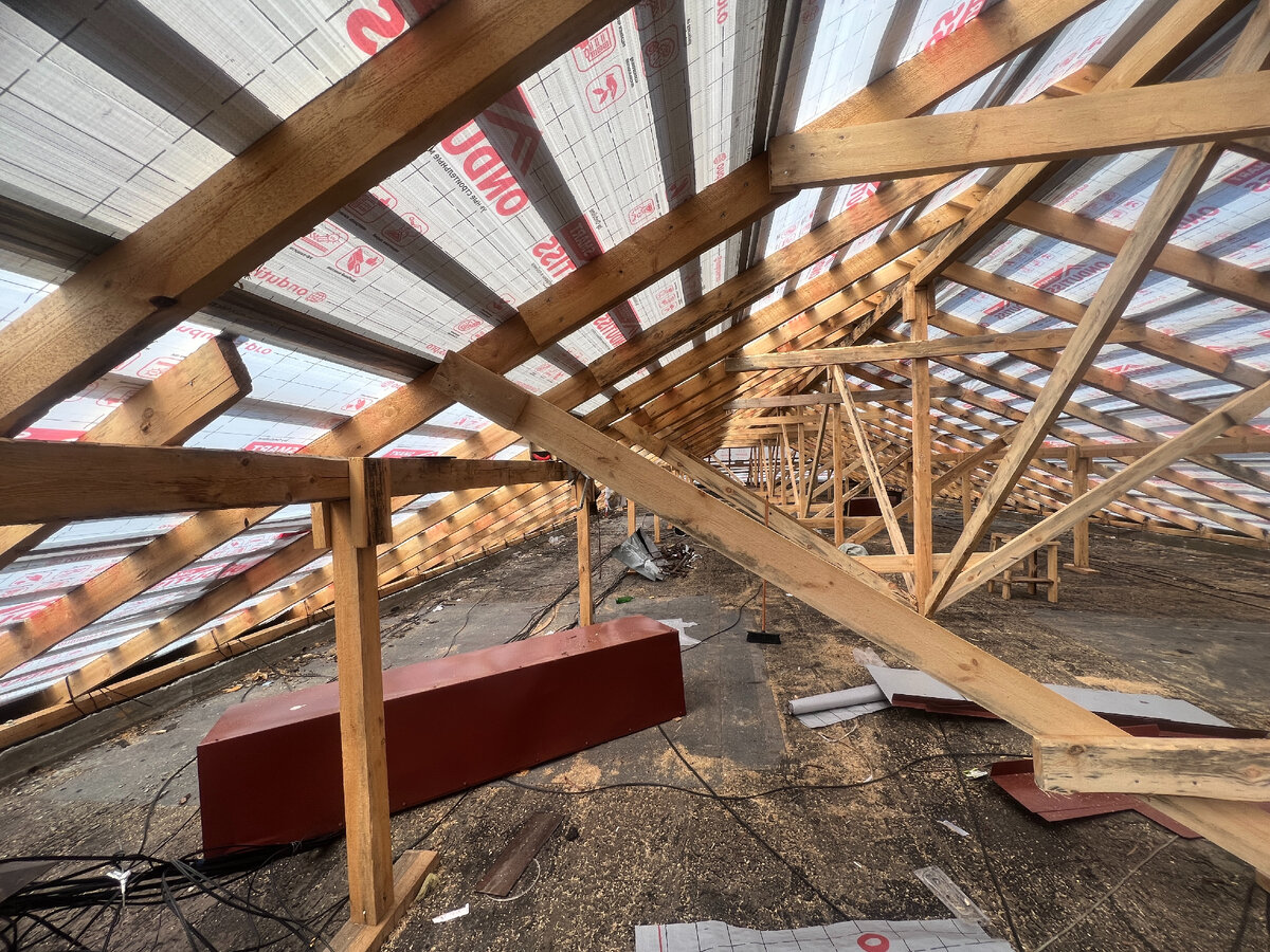 ➡️Результат Вы можете наблюдать на видео, полностью установлен технический желоб и карниз, собрана стропильная система, которая уже накрыта гидроизоляционной пленкой, собраны вентиляционные шахты(готовы к установке), собран металлический каркас противопожарной стены и ближайшее время приступят к укладке металлопрофиля.