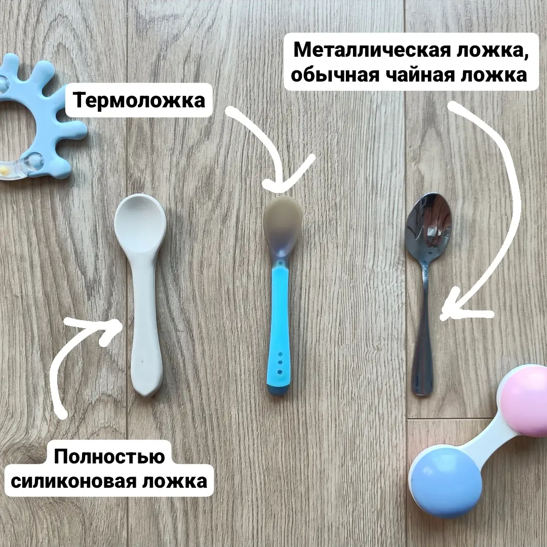 Я сравню ложки, которыми мы пользуемся с 6 месяцев. Первая - полностью силиконовая ложка. Купила в наборе с вилкой и тарелкой на присоске. Вилка полностью идентична ложке. Вторая - термоложка. Подарили в наборе с тарелкой-миской на присоске. Третья - обычная чайная ложка, которая у всех есть в доме. Мой ребенок пользовался всеми ложками. Иногда даже беру несколько сразу, потому что одна улетает и тогда я могу дать другую, чтобы не прерывать свою трапезу. По поводу полностью силиконовой ложки. По моему, она идеальна, чтобы просто дать её погрызть малышу. Она какая-то очень большая для его рта. Зачерпывает очень мало. При этом вся гнется. Не сильно, но я считаю это совсем не нужно. Термоложка оказалась более классной. Ну во-первых, ты реально можешь ей определить горячая ли еда в тарелке. Ложка светлеет при соприкосновении с горячим. Во-вторых, она не такая массивная и для детского рта как-будто идеально сделана. Обычная чайная ложка - плюс в том, что она у всех есть в доме. По