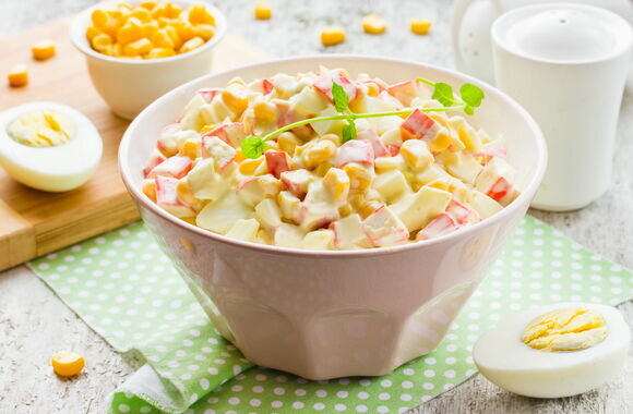 Решить проблему высокой калорийности поможет увеличение объема легких ингредиентов и, соответственно, уменьшение более сытных. Так, салат на основе крабовых палочек, огурцов, кукурузы и яиц с минимальным количеством риса и майонеза значительно «потеряет» в калориях. А если исключить рис и поменять заправку на йогуртовую, то вы получите вкусный ПП-салат.