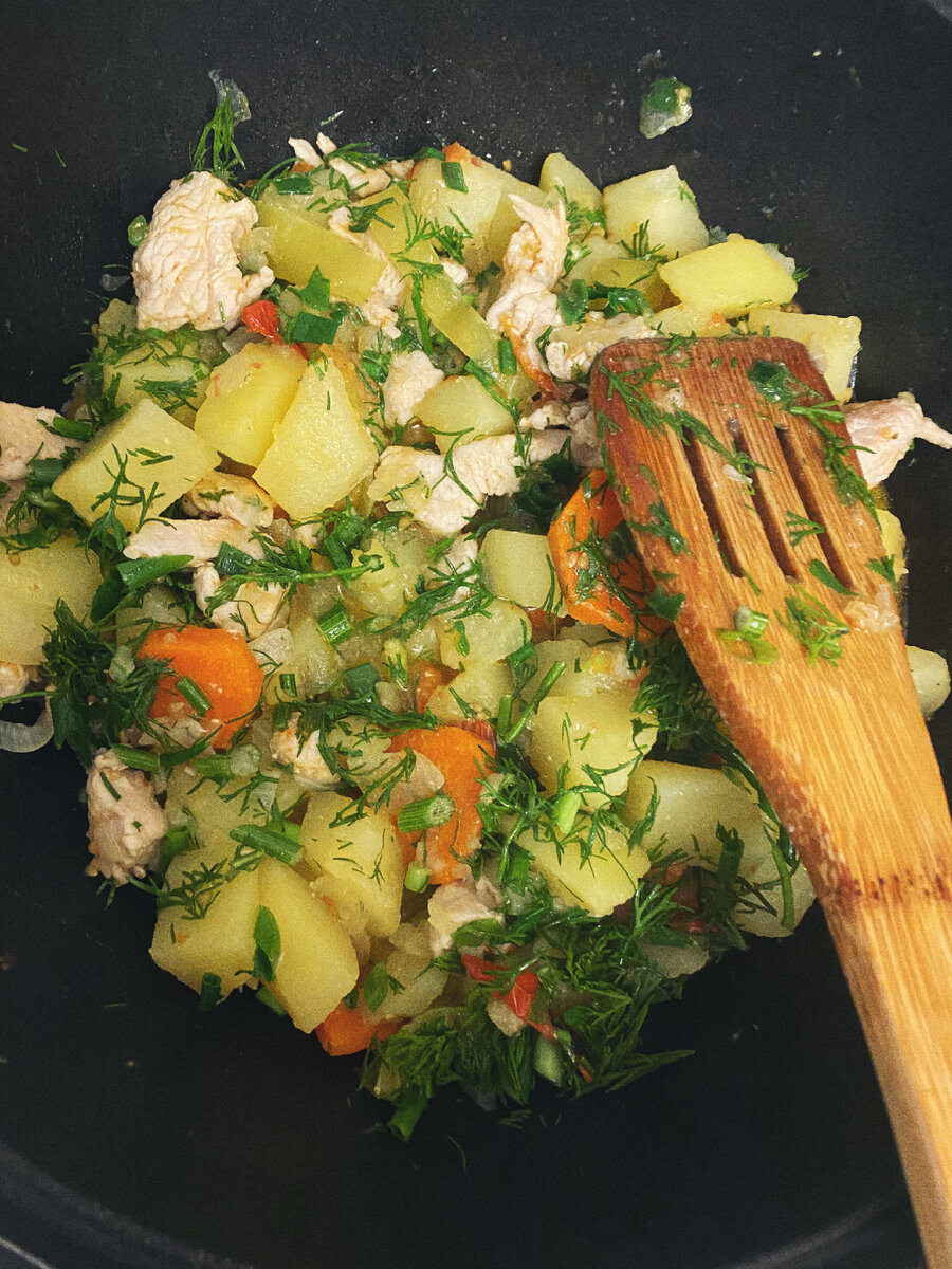 От такого блюда становится тепло ☀️ очень люблю дождь, в такие моменты хочется посидеть дома с семьей, приготовить горячее и заварить вкусный чай с печеньем… ☕️☕️☕️☕️☕️🫖☕️☕️☕️☕️☕️ поделюсь с вами одним из моих самых любимых и простых блюд. (В скобочках то, что использовала я) н у ж н о : (лук , морковь , перец) (индейка) (приправа роллтон) (зелёный лук и укроп) Овощи моем и нарезаем достаточно крупно Обжариваем слегка лук, морковь. Добавляем перец и мясо. минут 7-10 всё обжаривая перемешиваем 🥣 После того, как всё хорошо обжарим, добавляем помидор свежий , я добавила черри. Как видно на фото - я не сильно всё обжаривала, потому что угощала этим блюдом малыша! ❤️ Добавляем картофель, специи и немного воды, тушим под крышкой около 25-30 минут на среднем. Добавляем зелень. Готово 😍