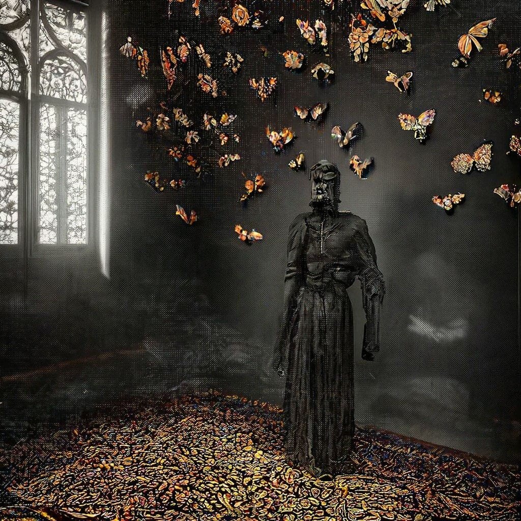 Когда минут через пять я выглянула из нашей комнатки, то увидела, что стены гостиной были покрыты этими бабочками, словно живыми обоями; они также летали по всей комнате, в которой от этого даже словно стало темнее. А у дальней стены, напротив меня, стояла призрачная тёмная мужская фигура.