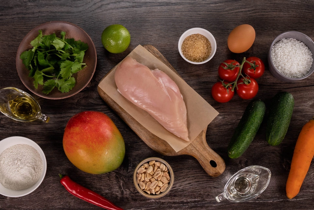 Ингредиенты: Куриная грудка 200 г Манго ¼ шт. Помидоры черри 4 шт. Морковь 1 шт. Огурцы короткоплодные 1,5 шт. Кокосовая стружка 30 г Яйцо 1 шт. Мука 50 г Подсолнечное масло 20 мл Кинза 2 веточки Арахис солёный 20 г Соль/Перец по вкусу Заправка Тростниковый сахар 2 ч. ложки Лайм 1 шт. Чили перец 1/3 шт. Оливковое масло 30 мл Соль Приготовление: Куриную грудку нарезать слайсами, посолить и поперчить по вкусу.Подготовить 3 миски для панировки: льезон (1 желток и небольшое количество воды), мука и кокосовая стружка. Слайс курицы отправить в муку, затем в льезон, а затем в кокосовую стружку. Таким образом запанировать остальные слайсы.На разогретую сковороду налить 20 мл подсолнечного масла и обжарить курочку с двух сторон до колера и готовности. Разрезать готовые слайсы курицы пополам. Морковь и огурцы нарезать соломкой, а помидоры разрезать на 4 части. * Манго разрезать пополам по косточке, обрезать шкурку и нарезать тонкими слайсами. Лайм отбить и выдавить сок в отдельную
