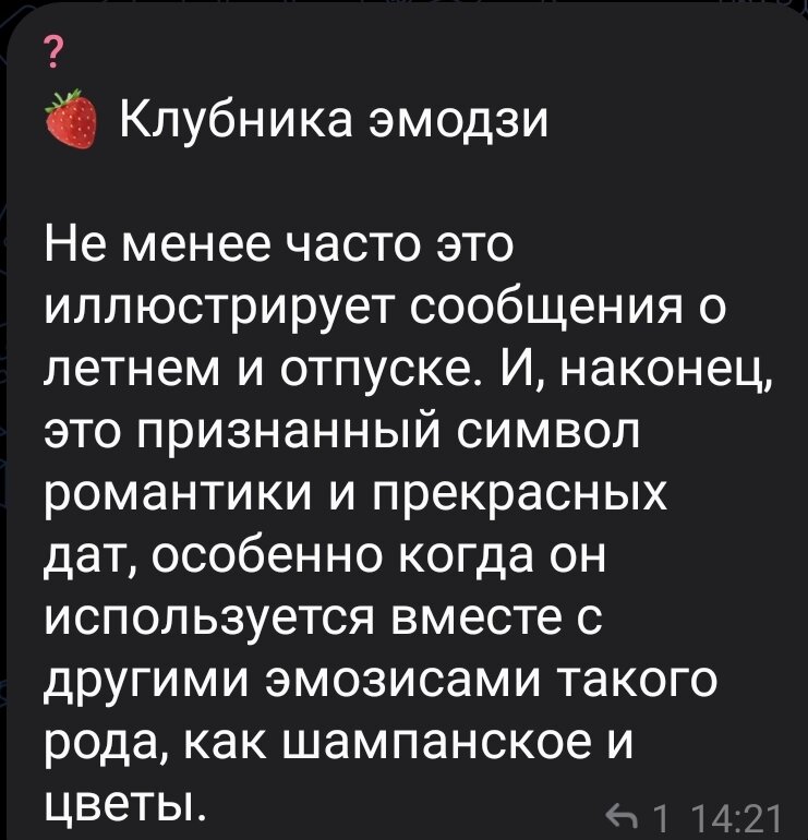 На данный момент в мире очень много смайликов для мессенджеров и каждый человек несёт отчасти свой смысл перед тем как употребить его в переписку. есть стандартные смайлики по типу радости😂 или грусти😭 которые сразу понятно какое состояние души отображают. но есть спорные, те котрые несут для всех не один единственный смысл как например клубничка. с одной стороны что может быть не обычного в всем привычной клубничке но все же она не такая обычная как вам кажется, и периодически в ней скрывается глубкокий смысл. наверное для огромного большенства это именно такое значение, но это не интересно и как обычно первое впечатления обманчиво. на центральном рынке сложилось кардинально другое мнение по поводу использования этого смайлик так получилось после того как Мила Киринова* (занесена в черный список Punsh Party на территории России*) ставила клубничную реакцию на более негативные коментарии. так же у Милы* есть свой - "эклюзивный" стиль фото. совместив клубничку и её стиль фот