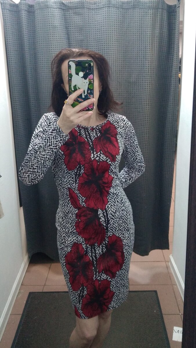 Здравствуйте. У меня с паспортом назревает серьёзный конфликт((, этот негодник мне сегодня опять годик приплюсовал. Уверена, что мне меньше лет, чем в документе. Я ещё играю в компьютерные игры и онлайн тоже, строю замки в Майнкрафте. Проверила из принципа и оказывается, что я ещё могу сделать " березку", пусть не идеальная она, немного кривоватая и со скрипом, но получилось же. Правда рядом стоял сын и был готов в любой момент вызывать скорую🤣, но обошлось. И большое человеческое спасибо нашей мудрой пенсионной реформе, без неё я бы через несколько лет была уже пенсионеркой. А теперь мне до пенсии как до Луны, еще молодая и шустрая девица, одним словом. А паспорт я запихну подальше, нечего мне настроение портить. Обзор из секонда Б/утик, цена 2100 за кг. Платье из толстого трикотажа. Считается, что крупный рисунок не идет маленькому размеру, но расположенные вертикально смотрятся неплохо. Очень я любила такие платья, были всякие-разные, но теперь почему-то хочется посвободнее и поуд