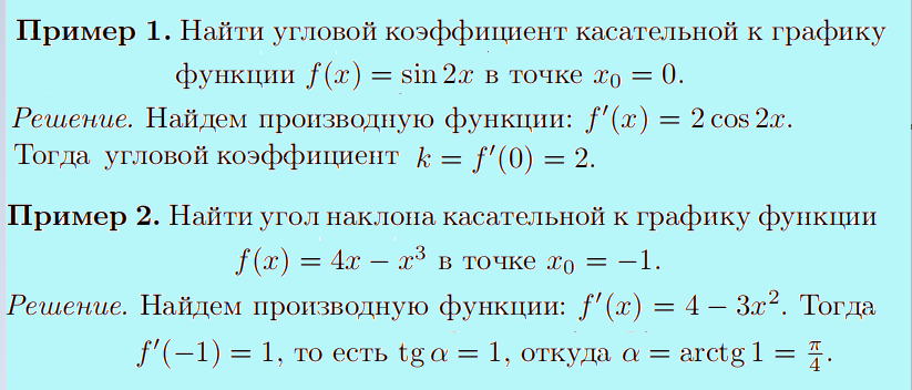 Наглядные задания иллюстрирующие применение производной для нахождения геометрических объектов - например, угла наклона прямой в выбранной точке, или параметра k уравнение прямой