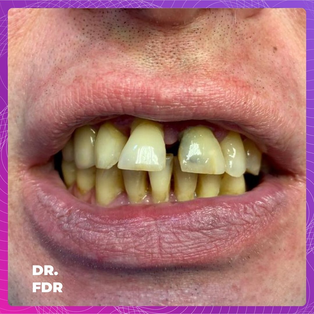 В нашу клинику обратился 45-летний мужчина с жалобами на неприятный вид своих зубов. У него были трудности при употреблении твердых продуктов, таких как мясо. Наблюдались серьезные проблемы: рецессия десны (из-за пародонтита), зубы были сильно расшатаны. На верхнем ряду были большие межзубные промежутки, частично оголены корни. Было много разрушенных и мертвых единиц.
