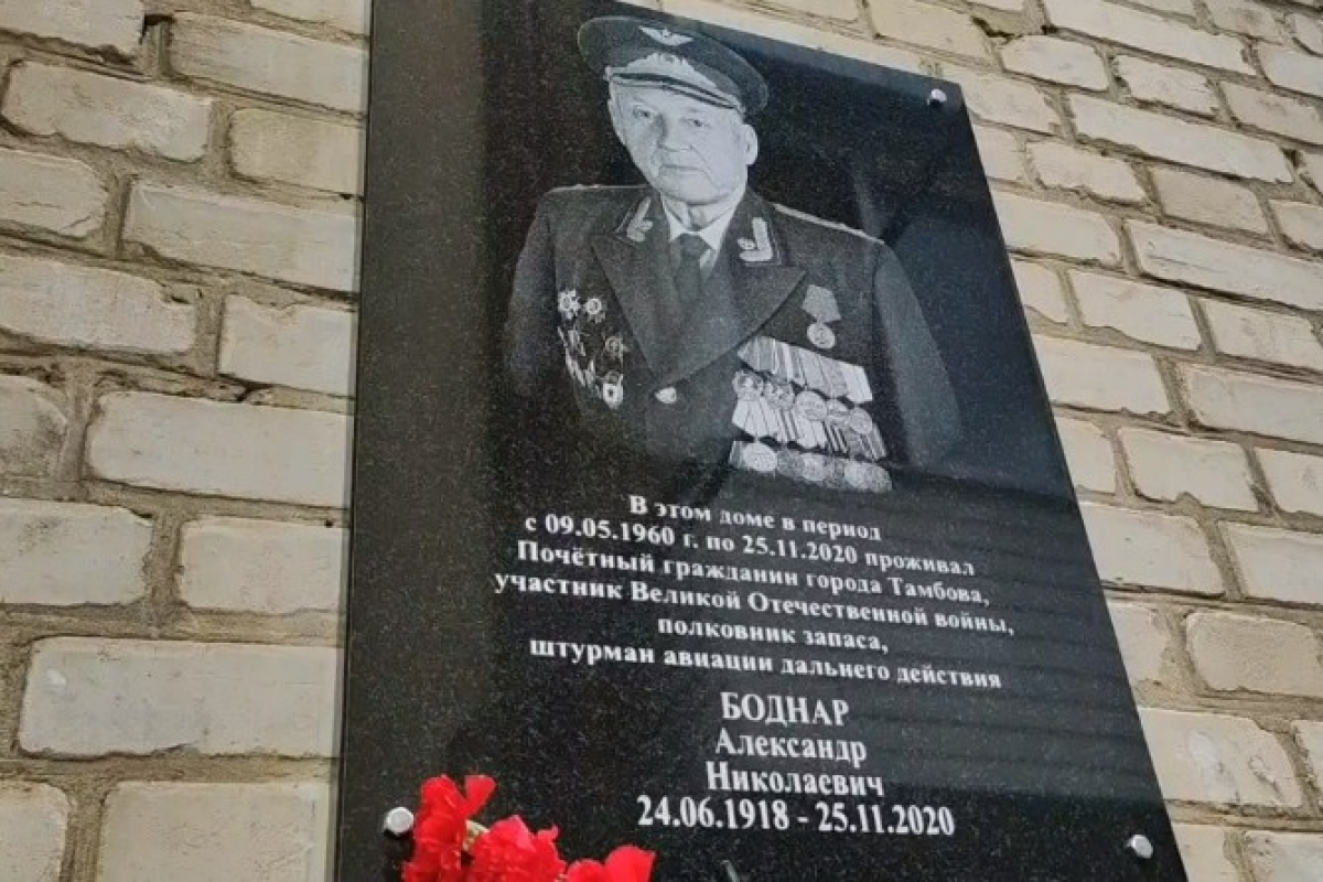 В Тамбове 24 июня прошла торжественная церемония открытия мемориальной доски в память об участнике Великой Отечественной войны, штурмане авиации дальнего действия и Почётном гражданине города Тамбова Александре Боднаре. Её разместили на стене дома на улице Мичуринской. Здесь ветеран прожил долгие годы. «Самое главное, что мы должны помнить: наш народ в годы войны проявил все свои высочайшие духовно-моральные качества. Это мужество и героизм, самопожертвование, сострадание, любовь к Родине. Мы обязаны говорить детям, что в той войне решалась судьба будущего, да и вообще самого существования нашей страны и народа. Говорить и о том, что каждый из 1418 дней войны был наполнен подвигами. Склоняя головы, мы должны сохранить историческую память и сопричастность подвигу предков, как наши главные ориентиры. А ещё – максимально жёстко и чётко, как того требует теперь время, обеспечить защиту исторической правды», – говорит депутат Тамбовской областной Думы, региональный координатор партийного п