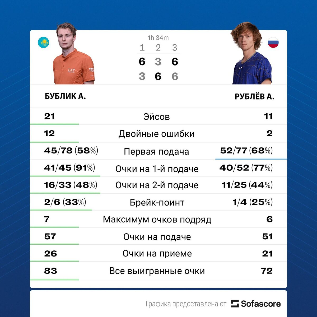 Вторая ракетка России Андрей Рублев второй раз за три года проиграл в финале турнира Ассоциации теннисистов-профессионалов (ATP) в немецком Галле с призовым фондом более €2 млн. В финале соперником Рублева был представитель Казахстана Александр Бублик, занимающий 48-ю строчку в рейтинге ATP. Бублик победил со счетом 6:3, 3:6, 6:3. Источник: Sofascore Бублик родился в Гатчине (Ленинградская область) и до 2016 года выступал за Россию. Теннисист выиграл второй турнир ATP в карьере. Это первая победа Бублика в четырех матчах с Рублевым. Победа в Галле принесла Бублику 500 рейтинговых очков и более €410 тыс. призовых. Рублев получит 300 очков и €220 тыс. призовых. В 2021 году Рублев уже доходил до финала турнира в Галле, но уступил французу Юго Умберу. С 3 по 16 июля пройдет Уимблдон — третий в сезоне турнир «Большого шлема». Букмекерская компания «Фонбет» считает фаворитом серба Новака Джоковича, ставки на его победу принимаются с коэффициентом 1,70, на победу Рублева — с коэффициентом 75,