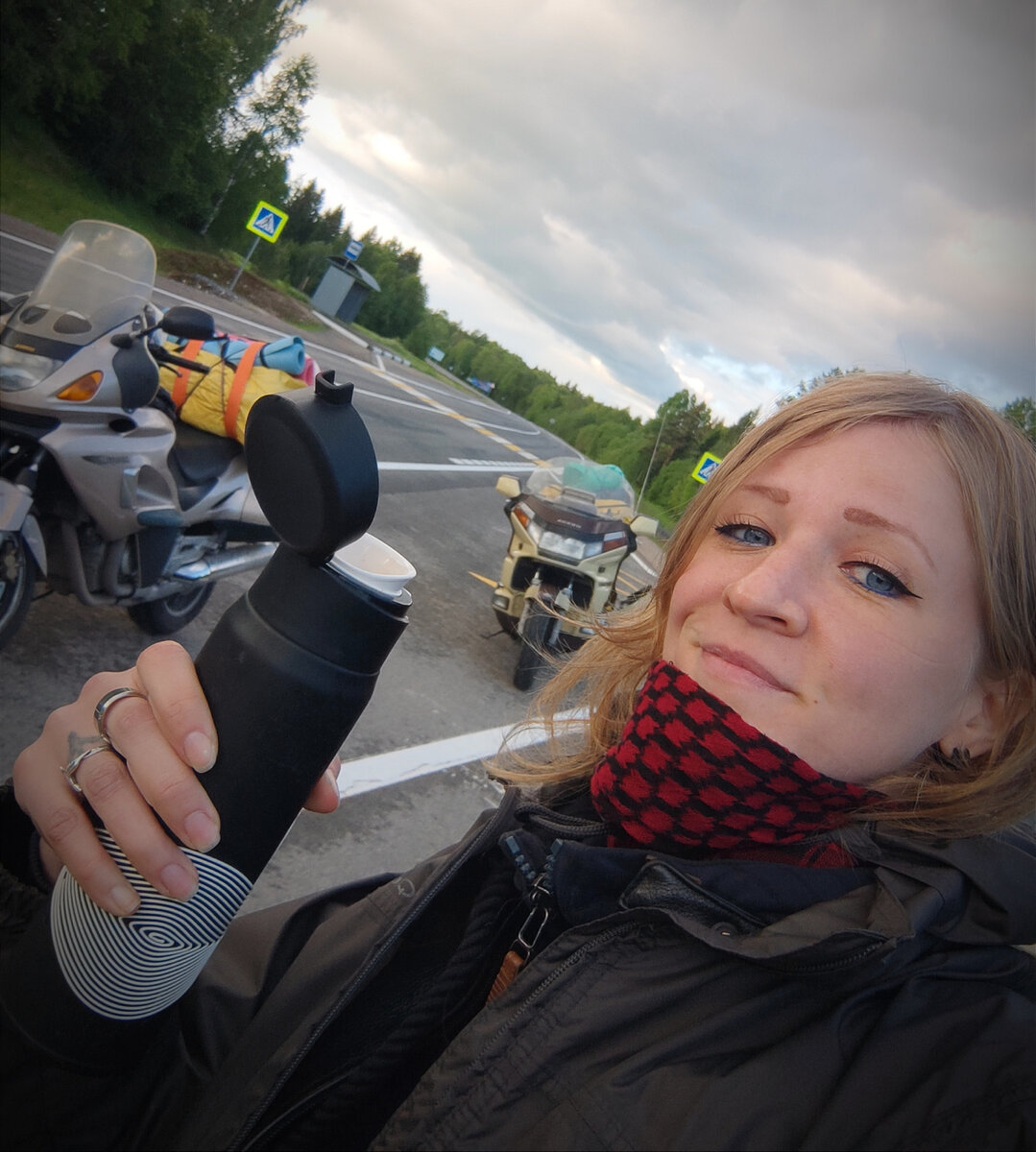 Вскоре, ситуация с погодой стала совсем печальной – температура упала до +7, и впереди фронтом стояла черная туча. Не став дожидаться первых капель, мы остановились на автобусной остановке, залезли в дождевики и утеплились.