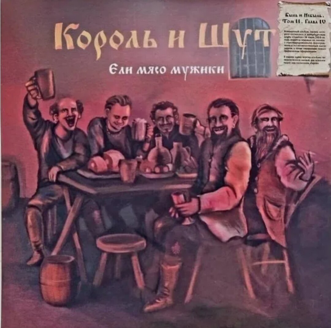 За столом сидели мужики и ели. Мясом конюх угощал своих гостей. Все расхватывали ужин и хозяин весел был О жене своей все время говорил. Ели мясо мужики, пивом запивали, О чем конюх говорил, они не понимали. Я узнал недавно: все вы, как ни странно, - Конюх хриплым голосом проговорил,- С моей бабою встречались втайне от меня И поэтому всех вас собрал сегодня я. Ели мясо мужики, пивом запивали, О чем конюх говорил, они не понимали. Я за ней не уследил - в том моя вина, Но скажите, правда вкусная она? Ели мясо мужики, пивом запивали, О чем конюх говорил, они не понимали. Ели мясо мужики, пивом запивали, О чем конюх говорил, они не понимали @ Король и Шут