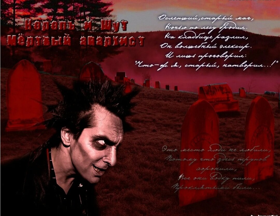 Ослепший старый маг Ночью по лесу бродил. На кладбище разлил Он волшебный эликсир, И лишь проговорил: "Что ж я, старый, натворил!" Трупы оживали, Землю разрывали, Всюду выползали, Дико бушевали, Глотки драли, Всё вокруг ломали, Рвали свою плоть. Это место Люди не любили, Потому что здесь Гадов хоронили. Все они водку пили - Проклятыми были. Припев: Среди ублюдков шел артист В кожаном плаще, Мертвый анархист. Крикнул он: "ХОЙ!!! ЧЕЛЮСТЬ ДОЛОЙ!!!" Трупов вел он за собой. Бешено в деревню Мертвые ворвались! В свете фонарей Рожи показались. Дрались и по полной отрывались - Шли дома громить. Взяли люди Топоры и вилы, Мертвецов загнать в свои могилы, Но на это Не хватило силы - Трупов не убить! (Припев) Среди ублюдков шел артист В кожаном плаще, Мертвый анархист. Крикнул он: "ХОЙ!!! ЧЕЛЮСТЬ ДОЛОЙ!!!" Трупов вел он за собой Был на руке застывший ФАК, Из кармана торчал пиратский флаг. Зомби всю ночь кричали: "ХОЙ!!! Мы, анархисты, народ не злой! " Что за наваждение! Без предупрежден
