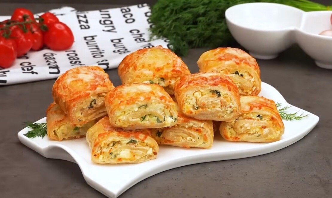 Ингредиенты: слоёное тесто — 600 г, сливочный сыр — 300 г, чеснок — 2 зубчика, сыр фета — 200 г, твёрдый или любой обычный сыр — 100 г, петрушка – 20 г, яйцо — 1 шт. Для соуса: желтки — 4 шт., растопленное сливочное масло — 100 г, лимонный сок — 20 мл, молоко — 50 мл, острая паприка — 2 г.