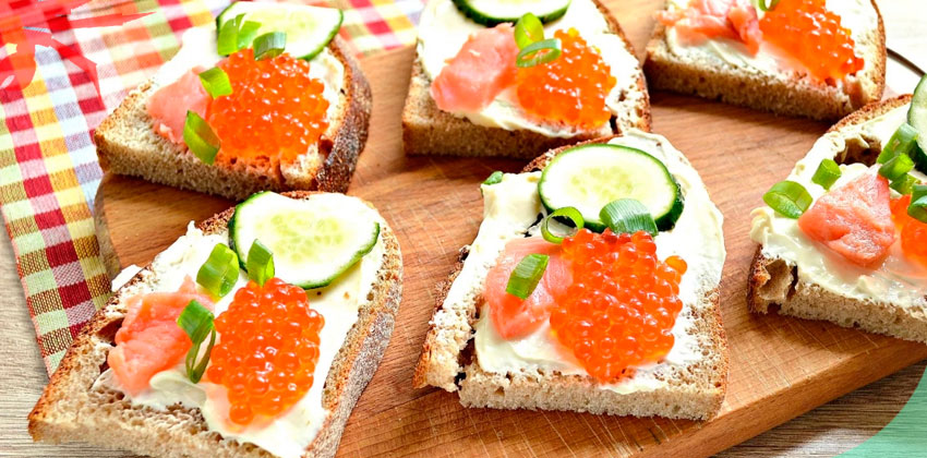 Ингредиенты: Для начала нарезаем хлеб и смазываем его сливочным маслом. Моем огурцы и нарезаем кружочками. По одному кружочку огурца аккуратно кладем с одной стороны бутерброда. Вторая сторона остается для икры. Берем баночку с икрой, открываем ее и ложкой выкладываем икринки на вторую, свободную, часть бутерброда. Берем тарелку, выкладываем листья салата, поверх кладем бутерброды, украшаем зеленью. Источник: https://wildcrab.ru/news?id=2079