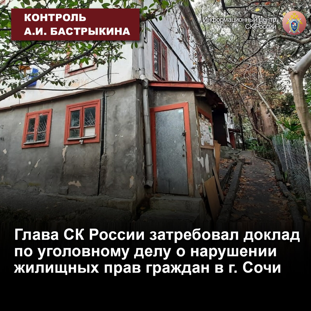 К Председателю СК России А.И. Бастрыкину в Приемную «ВКонтакте» вновь обратилась жительница города Сочи Краснодарского края. Она и другие жильцы аварийного дома, 1934 года постройки, по-прежнему вынуждены проживать в небезопасных условиях: в квартирах обвалился потолок, а конструкции здания перекосились. Также указывается, что земля под домом находилась в собственности жильцов, однако местная администрация незаконно, по мнению заявительницы, ее изъяла и предложила денежную компенсацию только за жилье, размер которой не позволяет приобрести равноценные жилые помещения.
