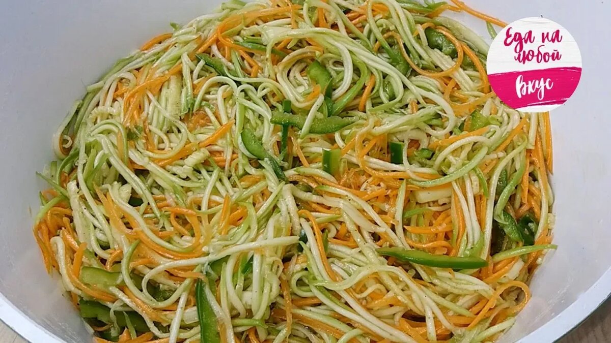 Салат из кабачков, моркови и сладкого перца – в меру острый, пряный и очень вкусный. Если вы до сих пор ищите, куда пристроить кабачки, то этот рецепт точно для вас. Готовится легко из доступных продуктов, а получается сочно, ярко и аппетитно. Как приготовить салат из кабачков по-корейски на зиму, смотрите ниже. Также в помощь видео рецепт. Удачных заготовок! Останутся вопросы, пишите, обязательно всем отвечу. Ингредиенты на один литр салата: Салат из кабачков по-корейски на зиму. Пошаговый рецепт 1. Кабачки необходимо натереть на корейской терке, если такой нет, то можно нарезать тонкой соломкой. Кстати, предварительно у зрелых кабачков снимаем кожицу и удаляем семена. 2. Следом соломкой нарезаем сладкий перец, так как кабачки имеют нейтральный вкус, то перец придаст аромат и дополнительный цвет салату. Иногда использую репчатый лук, который нарезаю тонкими полукольцами. 3. Осталось натереть свежую морковь, тоже на корейской терке. Также допускается натирать на самой крупной терке. 4.