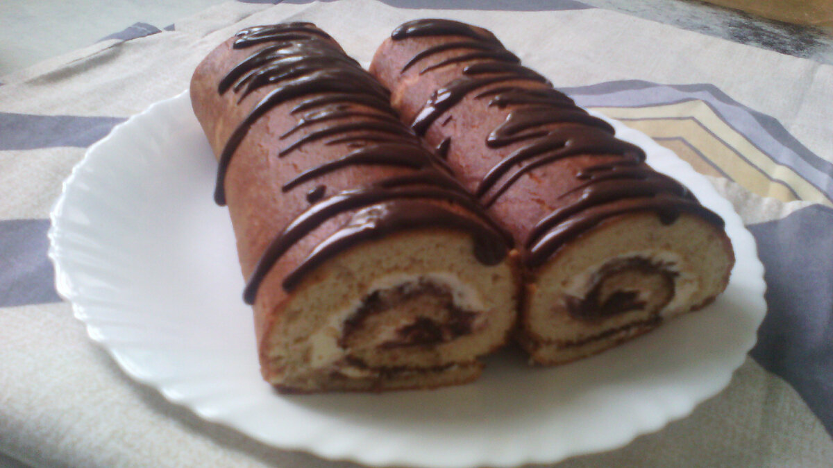 Теперь берем бисквит с одного края и сворачиваем. Для удобства я разрезаю бисквит на половинки.
