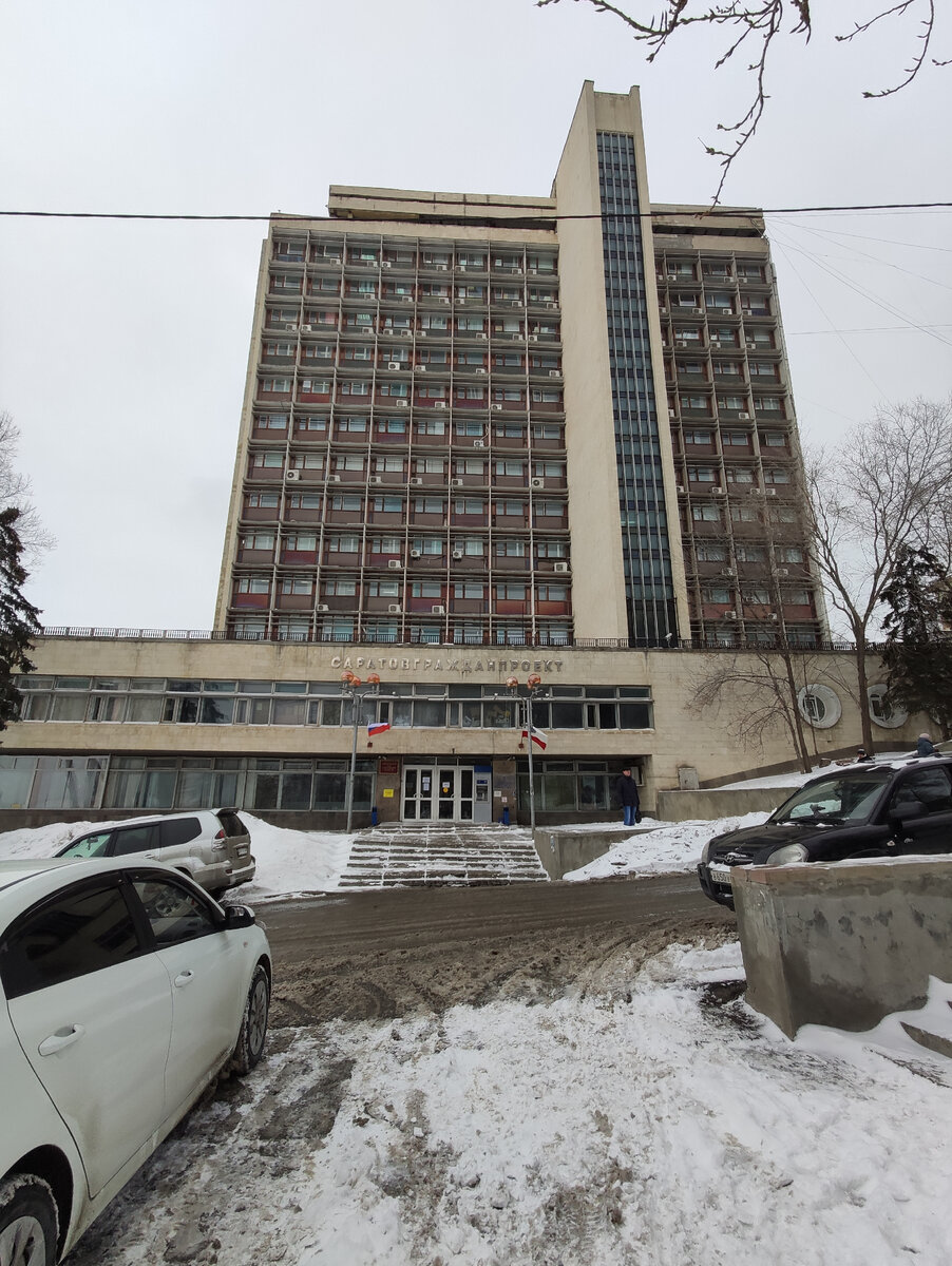 Сегодня поговорим о здании на набережной Космонавтов, с которого недавно сняли вывеску. Потому что предприятие, которое это здание проектировало и строило для себя, теперь отсюда выселено. Проект 15-этажного здания проектного института "Саратовгражданпроект" начал разрабатываться в 1971 году архитекторами Валентином Иринарховичем Скоробогатовым и Олегом Александровичем Гером. Первоначальный проект был максимально стекляшкой. Существовал даже вариант с летающей тарелкой! Но в итоге всё было доработано до существующего вида. Строилось здание до 1979 года. Советский модернизм. Здание, как бы отражающее противоположную часть набережной, где строилась гостиница «Словакия». Помимо тонких ровных линий, формирующих чёткий геометрический рисунок, круглые окна-иллюминаторы. Золотые огни дополняли картину дизайнерского шика 1980-х. А вот и вывеска, которой теперь нет. Эта фотографии я сделал 2 года назад. Внутри тогда ещё были все атрибуты института. Двухсветный атриум-фойе дополняется шикарнейш