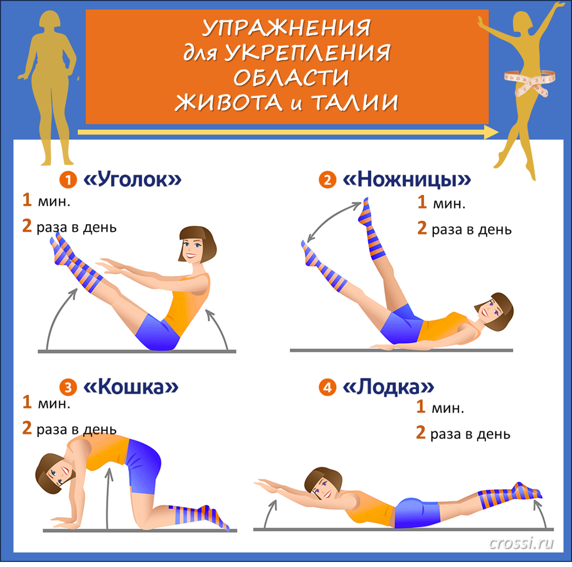 Предлагаем 4 упражнения, выполнение которых 2 р./д. по 1 мин. помогут подтянуть живот👍🏻: