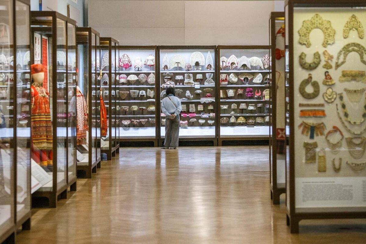 Как и на выставке 1890 года, в современной экспозиции буквально оглушала роскошью золотного шитья огромная витрина с женскими головными уборами. Как тогда, так и сегодня «кики, кички, повойники, начeльники, сороки, кокошники и проч., составлявшие головной убор наших северных губерний у бояр и простого народа, имеют большой этнографический интерес». Увидеть, как эта экспозиция выглядела сто с лишним лет назад, помогали представленные здесь те самые фотографии из альбома. По словам Елены Мадлевской, «они как бы соединяют две исторические точки: 1890-й и 2022–2023 годы с помощью одних и тех же вещей. А еще расширяют пространство самой выставки, дополняя его вещами, которые не удалось разместить». Для организаторов выставки важно было показать, что с премьеры коллекции сохранилось много предметов.
