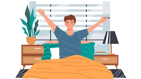 Первые минуты после пробуждения - важное время для организма в начале дня. Рекомендуем поставить будильник на 5-10 минут раньше, чтобы не спешить. Лежа в кровати, сделайте несколько медленных глубоких вдохов и выдохов. Потяните суставы. Помассируйте мочки ушей, голову, пальцы рук. Вставайте медленно, без резких движений.