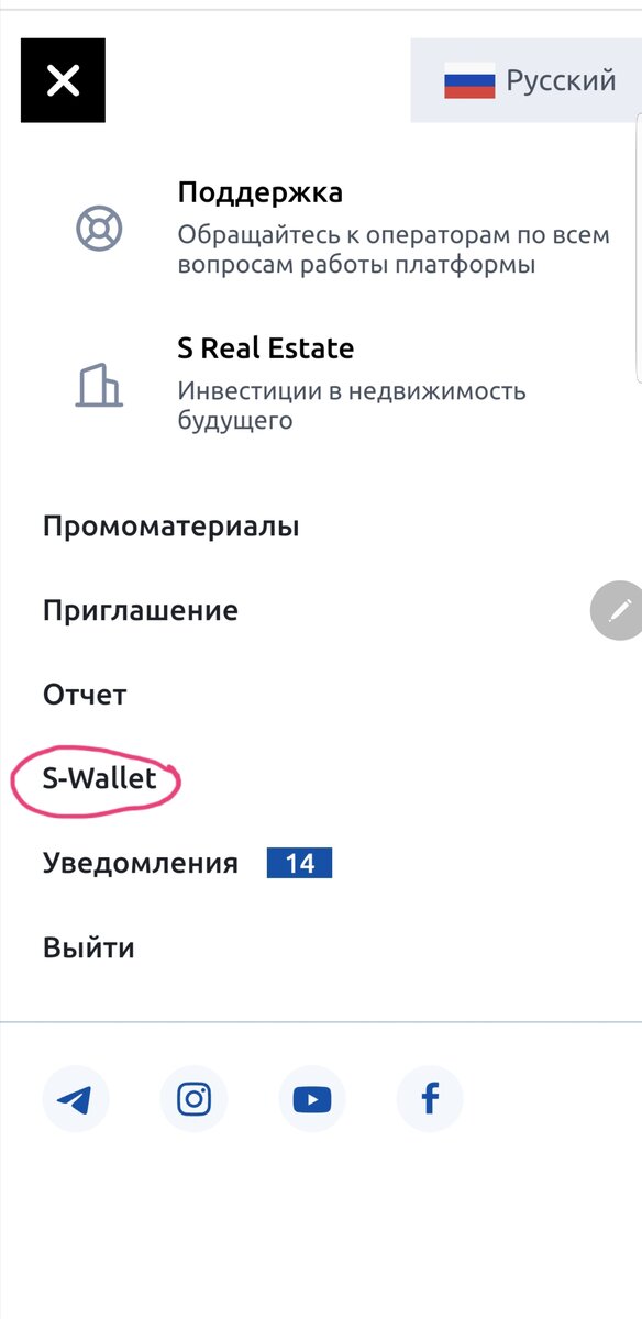 Для того что-бы пополнить личный кабинет S - Group нам нужно зарегистрироваться в электронном кошельке S - Wallet. Заходим в личный кабинет S - Group, нажимаем на черный квадратик слева вверху , выбираем S - Wallet и нажимаем. Далее у нас откроется окно для регистрации нажимаем создать аккаунт. Вводим свои данные и придумываем пароль. Нажимаем Регистрация. Открывается окно входа в кошелек. Вводим электронную почту и пароль. Нажимаем Войти. Появляется белое окно Подтвердить авторизацию, нажимаем получить код. Код приходит на электронную почту, копируем его и вставляем в окошко. Нажимаем отправить и попадаем на главную страницу кошелька S - Wallet. Далее нам нужно настроить безопасность, для этого подключаем телеграм бот. Нажимаем на кружочек с человечком, настройки, безопасность. Выбираем Telegram 2FA, нажимаем зеленую кнопочку Включить, появляется белое окошко, нажимаем прислать код, копируем код с электронной почты и вставляем его. Появляется окошко Активировать Telegram 2FA