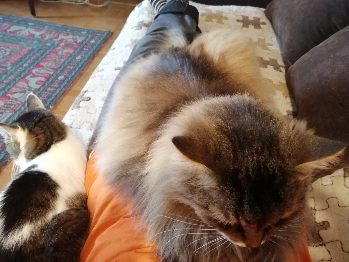 Моё утро, если я не подрываюсь с кровати по будильнику, проходит вместе с котами. У нас, точнее, у котов есть одна интересненькая привычка. Вот не понимаю, как это происходит. Если ночью я ворочаюсь с боку на бок, коты не обращают на это внимания. Но стоит мне проснуться уже по-настоящему, даже если я не шевелюсь, даже если у меня глаза ещё закрыты, коты немедленно, бегом, кто вперёд, атаковывают меня вместе с кроватью и постельными принадлежностями. Кузя со мной не особо церемонится. Она проходит по мне, как по асфальту и с размаху плюхается на мой живот. - Вообще-то это моё. Куда хочу, туда и ложусь. И где хочу, там и топчусь. А Маркиз у нас очень «скромный» товарищ. Не в ногах же устраиваться. Он просто ложится всем своим немаленьким тельцем на подушку, почти мне на голову. Прямо как будто опоясывает её. Прямо вот как будто на меня меховую шапку одели. При этом он тоже не задумывается и не спрашивает разрешения ходить лапами по моей подушке. - А я что? Я – ничего. Кузе можно, а мне
