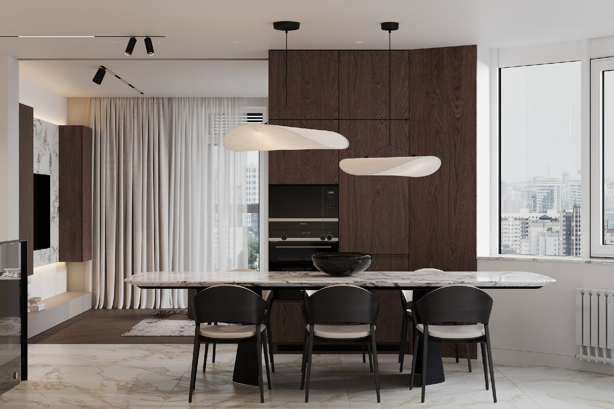 Основным помещением на первом этаже является просторная кухня-столовая с очень большим обеденным столом. Здесь можно принимать гостей, проводить время за завтраком всей семьей и наслаждаться вечерними настольными играми. Большие акцентные светильники над столом создают особую атмосферу в помещении.