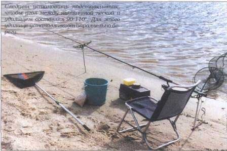 Далее следует собрать сидение, установить подставки так, чтобы угол между натянутой леской и удилищем составлял 90-110°. Для этого удилище устанавливают параллельно берегу. На течение удилище располагают иначе: обычно перпендикулярно береговой линии. Мой личный опыт ужения фидером на водоемах с заметным течением невелик, поэтому затрагивать нюансы ловли в реках я не буду.