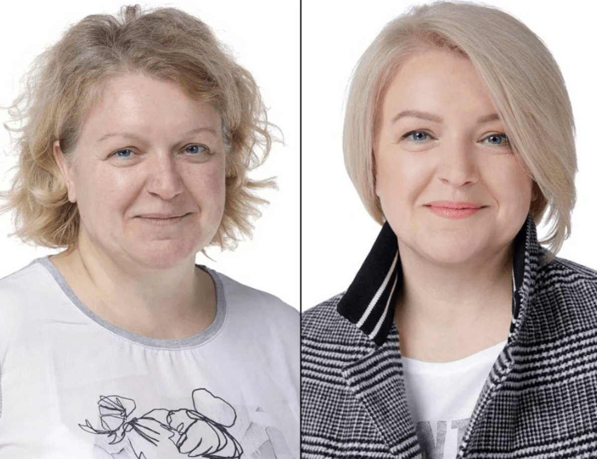 - А эта симпатичная женщина, видимо, по какой-то причине перестала заботиться о своей внешности. Она просто собирала отросшие волосы в небрежный пучок и забывала вовремя подкрашивать корни. Симпатичная стрижка округлой формы прекрасно подошла к форме лиц. Оттенок выбрали темный, но он отлично подошёл к цветотипу женщины, сделав внешность более контрастной и яркой.