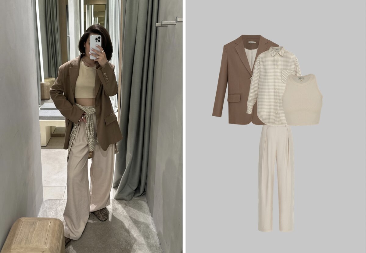 При составлении летнего гардероба главный ориентир — это комфорт. Когда ничего не хочется усложнять, спасает база. Показываем 4 беспроигрышных образа на каждый день, которые легко повторить и которые будут актуальны в любой ситуации, вне зависимости от планов. Майка укороченная + жакет изо льна + брюки палаццо + рубашка в клетку Палаццо — лучшая альтернатива классическим брюкам на лето. Свободные, широкие и не сковывающие движений, в сочетании с жакетом изо льна они составят идеальный тандем. Добавьте облегающую укороченную майку, а в качестве дополнительного акцента повяжите на талии рубашку. Топ укороченный + жакет изо льна + юбка с разрезом Длина миди — один из главных трендов наступившего сезона. Поэтому юбка классического прямого силуэта — настоящий маст. Сочетайте ее с объемным жакетом или отдельно с облегающим топом. Любой вариант абсолютное попадание в цель. Майка укороченная + рубашка + брюки парашюты Несмотря на расслабленный силуэт, брюки парашюты эффектнее всего выглядят с