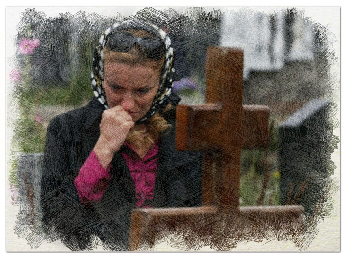 Кладбище на окраине города. У свежей могилы стоит молодая девушка в траурной одежде.