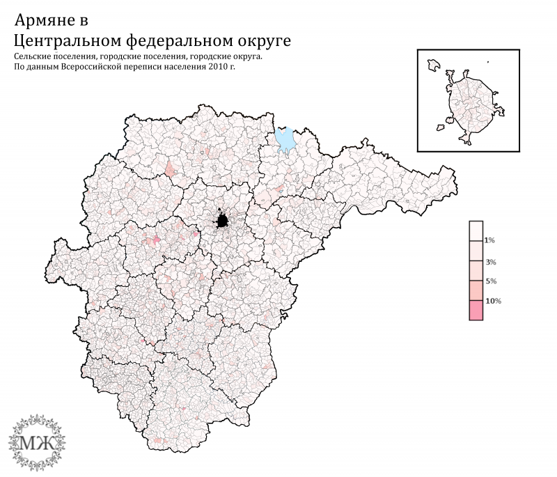 Самые большие доли армян сосредоточены в основном Калужской области, единичные места с преобладанием свыше 10% есть также в Белгородской, курской и Воронежской областях. Самая высокая доля в Горбачёвском сельском поселении Мосальского района Калужской области — 18%. При этом, на все десятипроцентники, только в одном есть село свыше 100 человек с армянским большинством — деревня Смахтино Михеевского сельского поселения Малоярославецкого района.