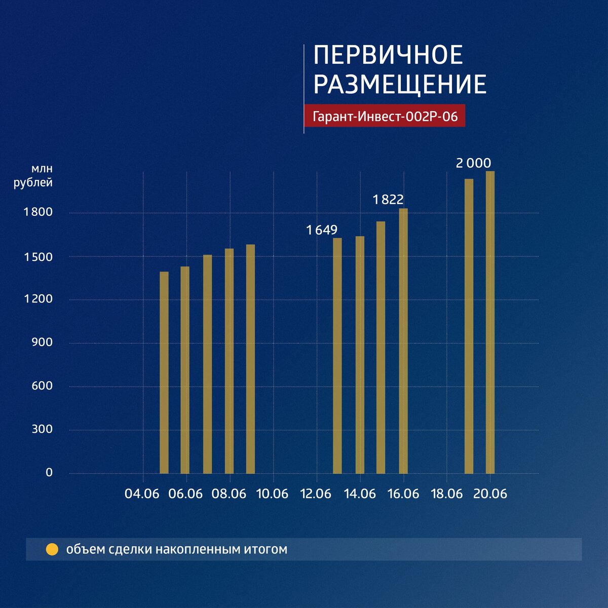 Во вторник 20 июня АО «Коммерческая недвижимость ФПК «Гарант-Инвест» завершило размещение двухлетнего выпуска облигаций серии 002Р-06 объемом 2 млрд рублей, за первые два дня недели реализовав бумаги на 177,5 млн рублей. Размещение займа началось 16 мая. На неделе по выпуску прошел также максимальный объем торгов — более 105 млн рублей, а цена доходила до 103% от номинала и даже пятничные рыночные риски отразились на котировках не существенно.