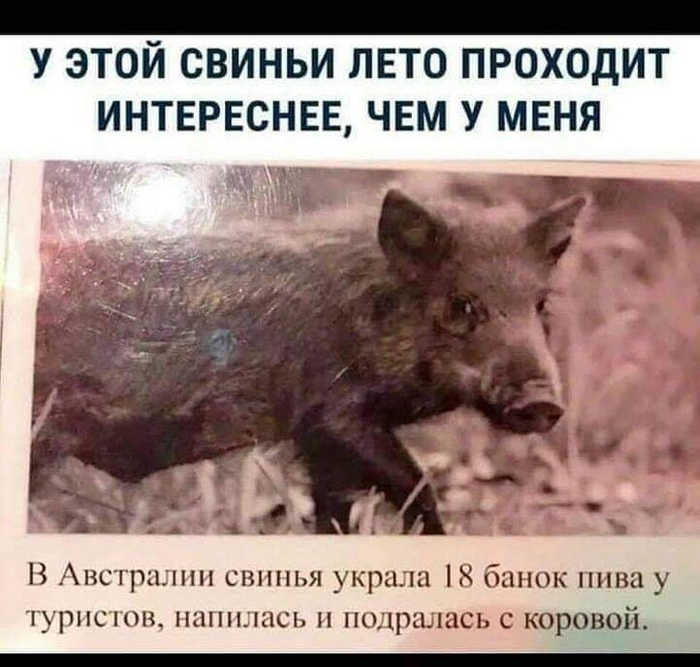 Курьезный случай с участием одичавшей свиньи произошел с отдыхающими на природе туристами в Австралии. Среди ночи отдыхающие туристы были разбужены странными звуками. Выбравшись из палаток и обследовав территорию лагеря туристы обнаружили свинью, которая в поисках еды забралась к ним в лагерь и копалась в запаснике с едой, разрывая паки с баночным пивом, употребляя содержимое банок прокусывая их своими зубами. Вероятно, что одичавшая свинья забралась в лагерь, чтобы полакомиться остатками еды в мусорных мешках, однако на этот раз ей удалось добраться до запасника с едой. После доброй порции отличного австралийского баночного пива свинья находясь в состоянии алкогольного опьянения, устроила драку с коровой, которая паслась недалеко от палаточного лагеря. Парнокопытное животное пыталось вначале дать отпор разбушевавшейся свинье, однако затем оставила эту затею, предпочла спастись бегством. Немного поносившись по лагерю уставшая свинья после такой бурной попойки и драки с коровой направи