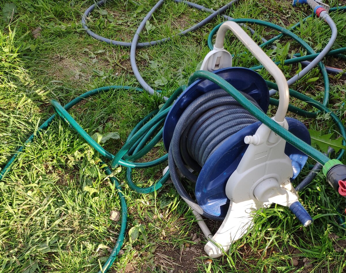 Сейчас же даже укороченный, даже с катушкой, он совсем перестал быть актуален. Во-первых - он очень тяжёлый, во-вторых - совершенно не мобильный. Раскручивается с катушки волнами (эффект бигуди), которые сшибают всё на своём пути и категорически не дают уложить его ни в одну борозду. Пока с ним воюешь - и перепсихуешь, и перепачкаешься. Всё время держать его задранным над головой - тоже так себе развлечение. Для переносного варианта он категорически не подходит, а без катушки его использовать и вообще никак - тяжело, неудобно и одних рук не хватает.