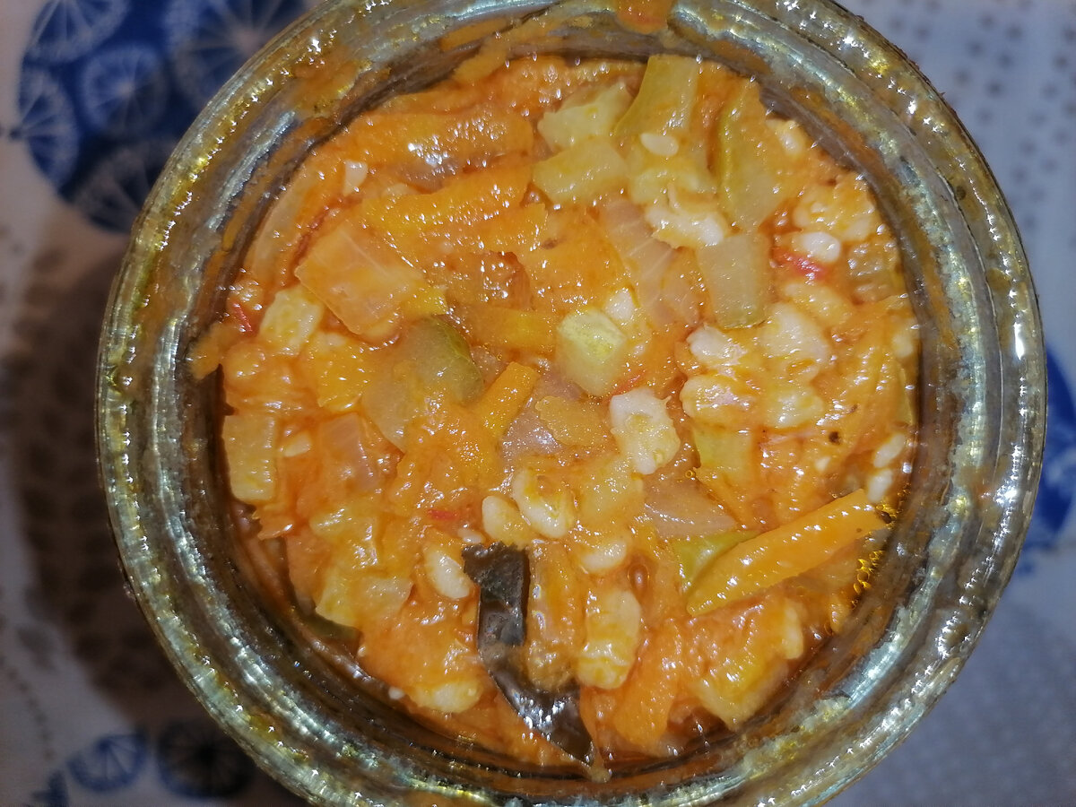 В кастрюле смешиваю морковь, лук, огурцы. Отдельно мешаю соль, растительное масло, томатную пасту, сахар и этой смесью заправляю овощи. Варю всё 40 минут. Добавляю варенную перловку и провариваю ещё 5 минут. Добавляю уксус , выключить.
