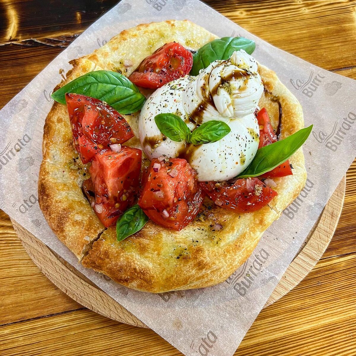 Корнер La Burrata открылся на Гастрокорте. В меню блюда с бурратой и, соответственно, с моцареллой и страчателлой. Судя по всему, собственного изготовления. К открытию имеет отношение шеф Даниэль Шарипов. Насколько я понимаю, он ставит кухню. Фокачча с бурратой и томатами по 510 ₽. Помимо указанного в составе замечены листья базилика, мелко порубленный лук и бальзамический соус. Да вот, собственно и всё. Подаётся блюдо на круглой дощечке. Приборы пластиковые, но этого сразу и не поймёшь — выглядят как металлические. Видел такие на рейсах Аэрофлота. Выглядят дорого. Прилагают влажную салфетку. Большой плюс. Красные томаты, белоснежная буррата, золотистая лепёшка, зелень базилика. Блюдо вызывает аппетит от одного только взгляда. Что по вкусу? Лепёшка-основа сама по себе хороша! Очень вкусное тесто. И когда тёплое ещё, и когда уже остынет. Такую лепёшку я и без бурраты бы съел с удовольствием. Основа разрезана на четыре части, поэтому я и буррату разрезал на столько же частей.